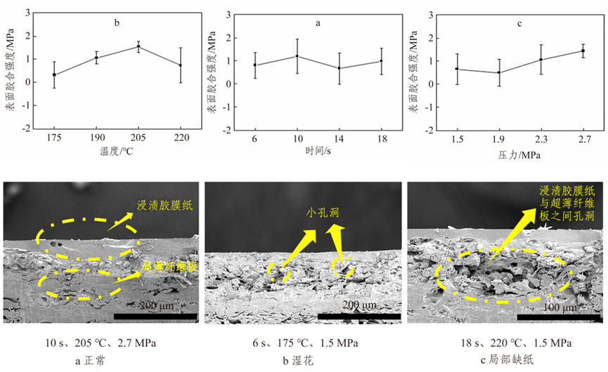 圖:熱壓工藝對(duì)飾面板表面膠合強(qiáng)度影響的直觀分析圖以及斷面微觀形貌