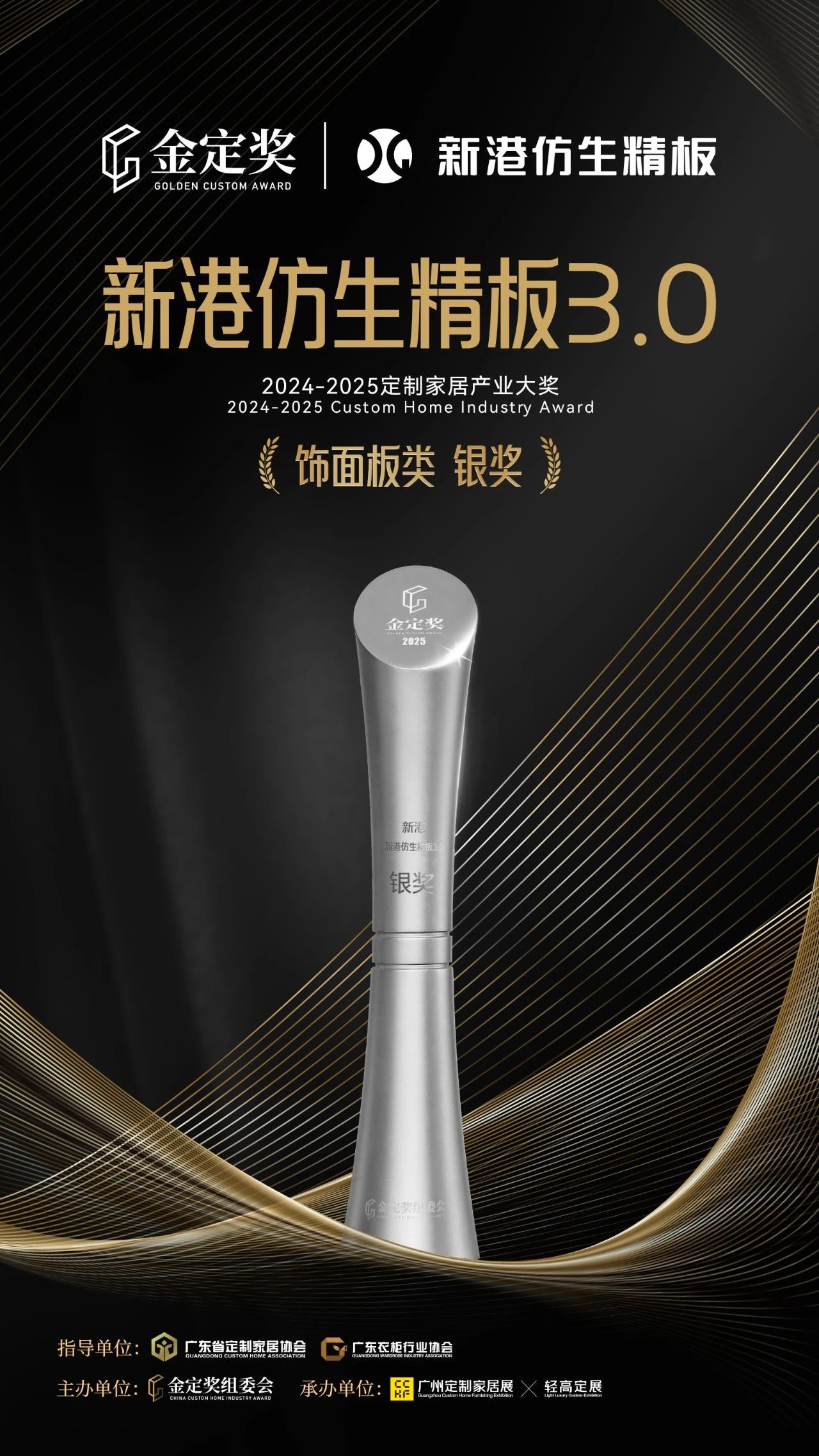 新港集團重磅新品——新港仿生海洋板,憑借其獨特的仿生科技、出色的環保性能,在眾多參賽飾面板產品中脫穎而出,一舉榮獲金定獎(飾面板類)金獎;一同獲獎的新港仿生精板3.0,也憑借其卓越環保性能與穩定品質,斬獲金定獎銀獎榮譽稱號。這些獎項不僅是對新港集團產品的肯定,更是激勵著新港集團在未來繼續創新前行,為定制家居行業的發展貢獻更多力量。