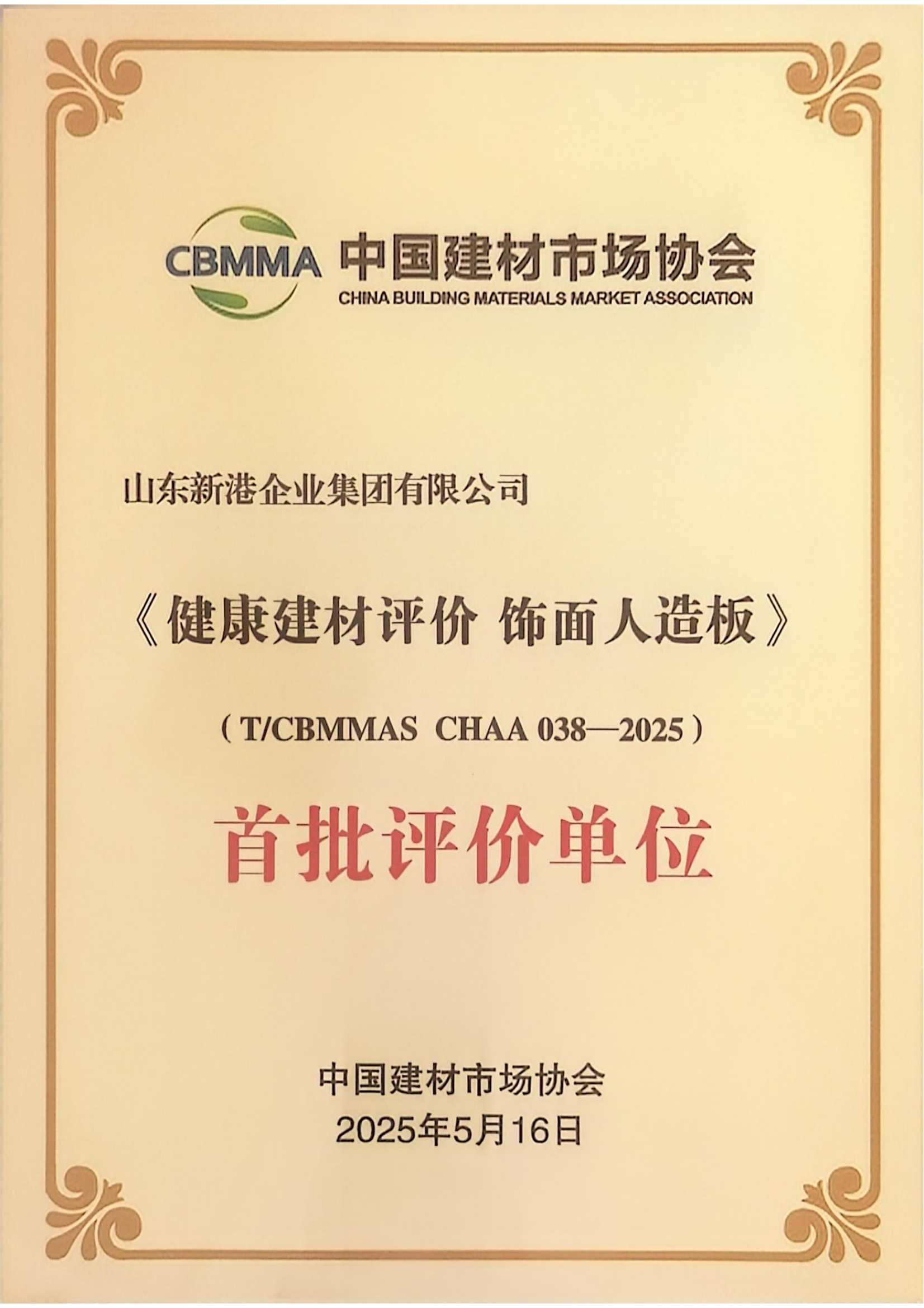 會(huì)議現(xiàn)場(chǎng),山東新港企業(yè)集團(tuán)有限公司被授予《健康建材評(píng)價(jià)-飾面人造板》標(biāo)準(zhǔn)首批評(píng)價(jià)單位稱號(hào)。此次榮譽(yù)的獲得,不僅是對(duì)新港集團(tuán)深入踐行“雙碳”目標(biāo)、長(zhǎng)期深耕環(huán)保領(lǐng)域的高度肯定,更是其在推動(dòng)人造板行業(yè)健康發(fā)展與團(tuán)體標(biāo)準(zhǔn)規(guī)范化、專業(yè)化發(fā)展進(jìn)程中的重要里程碑。