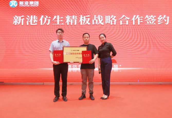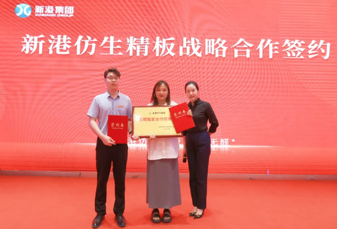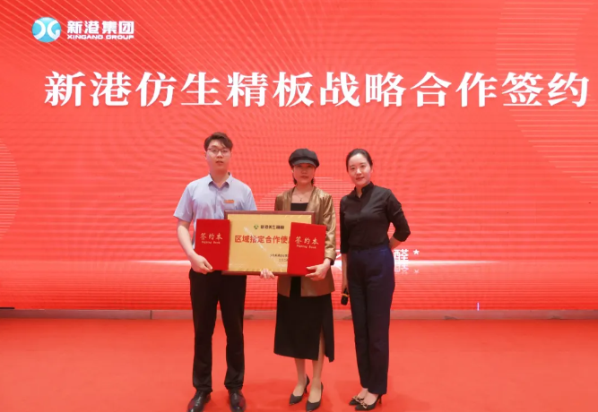 在品牌萬里行活動現場,新港集團副總裁姜婷婷、新港仿生精板運營總監劉軍、研發一部主管孟德森,立足消費者真實需求,深度剖析新港仿生精板在環保性、功能性、裝飾性及品牌力四大維度的加速賦能路徑。