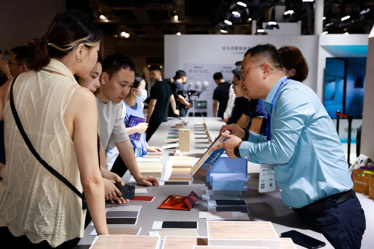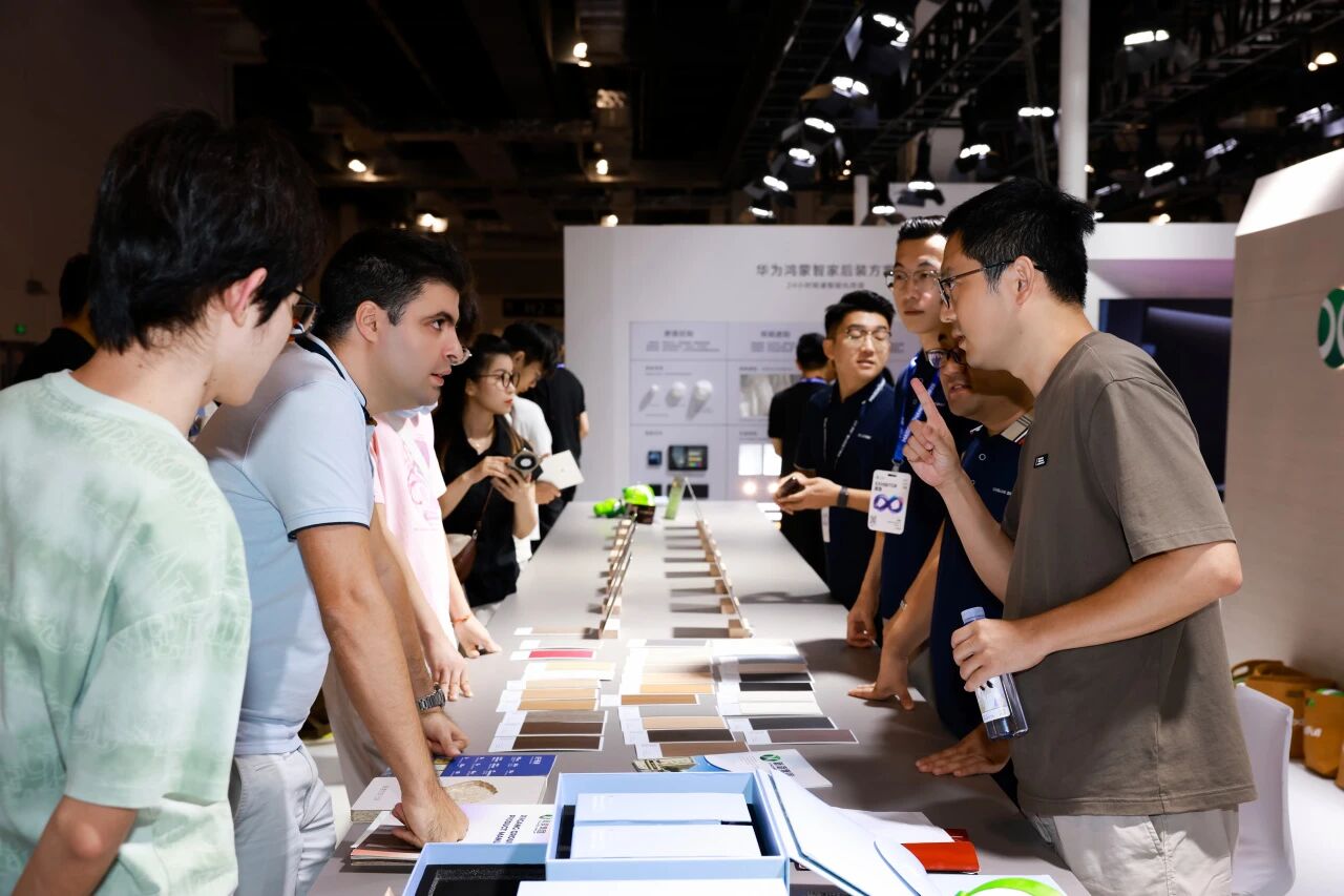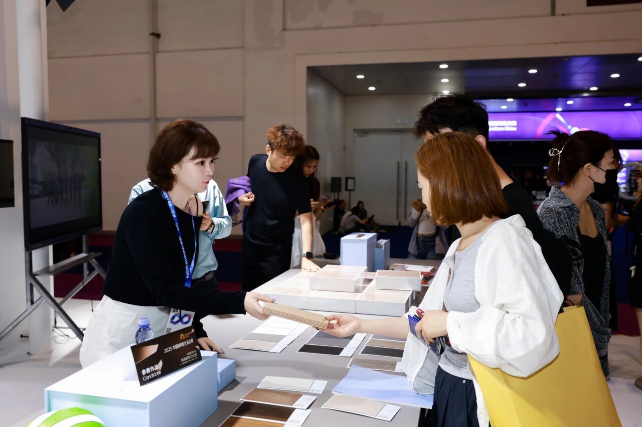 師生們對新港最新推出的EBP系列大師花色表現出濃厚興趣,紛紛駐足交流,從紋理工藝到環保性能,從設計靈感到空間應用,展開了熱烈探討。
