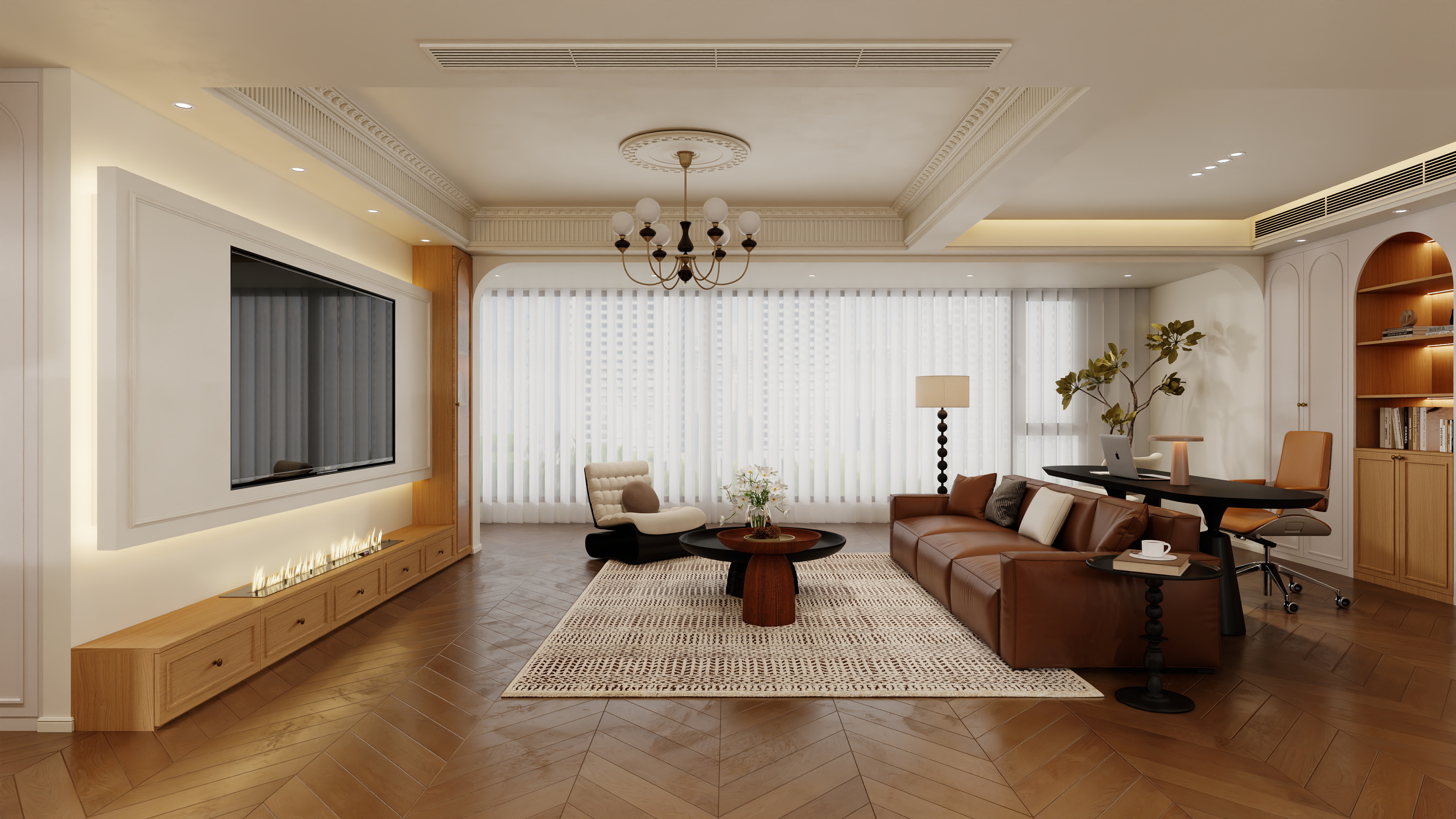 客廳的柜體以霧灰和甄品胡桃為主色調,用人字拼木地板鋪陳歲月紋理,暖調燈光、絨面沙發與復古地毯相互映襯,每一處都藏滿浪漫細節。